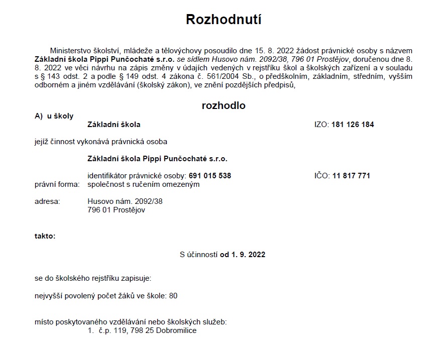 Provozní informaceMáme volná místa pro domškoláky, kteří hledají školu postavenou na principech sebeřízeného vzdělávání. -